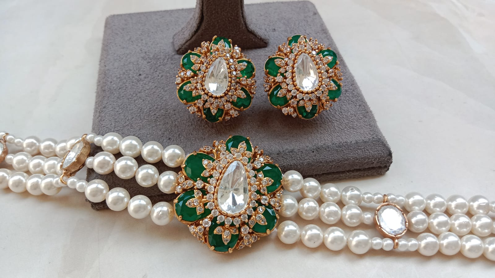 Elevate your festive and bridal look with the Choker Set, beautifully designed with intricate carving on a rich green base. Adorned with shimmering Polki diamond stones and finished with elegant pearl strings, this piece brings together traditional craftsmanship and royal elegance. A perfect blend of artistry and luxury, it’s ideal for weddings, receptions, and grand occasions.
