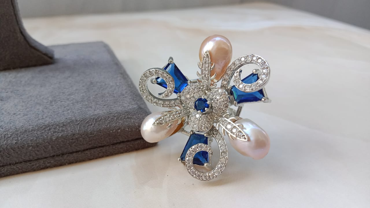Grace meets glamour in this exquisite Adjustable AD Ring. Adorned with finely cut American diamonds that shimmer with every move, this piece is finished in high-quality rhodium plating for a sleek and timeless look. Its adjustable design ensures a perfect fit, making it a versatile addition to your jewellery collection β ideal for both festive and everyday elegance.