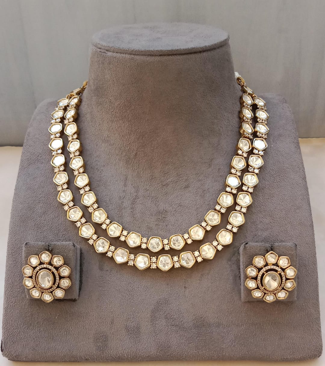 Enhance your ethnic elegance with this timeless double-line Polki Kundan necklace set, crafted to radiate pure sophistication. The necklace features two graceful rows of handcut Polki stones, each set in a refined gold-plated frame, creating a soft yet luxurious shine.