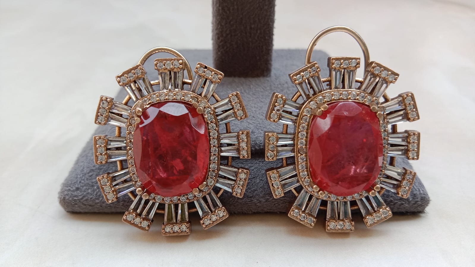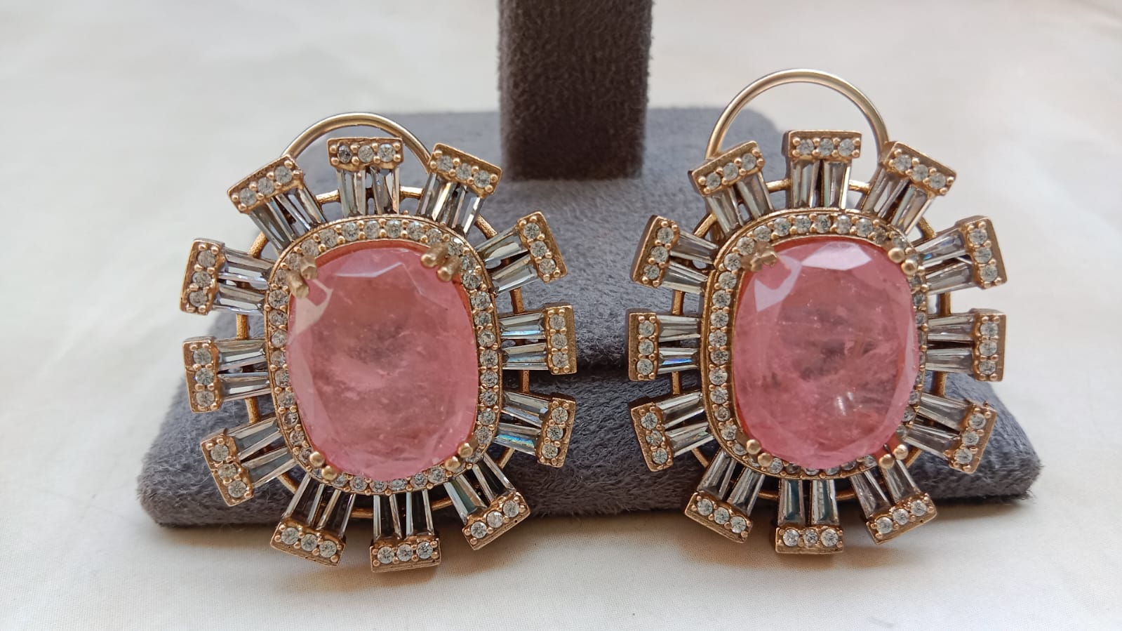 dd timeless elegance and a burst of color to your jewellery collection with our Luxury Multicolor Gemstone Statement Earrings. Crafted by Aryanz Jewellery, these stunning designer earrings feature a bold oval-cut gemstone centerpiece in vibrant shades of emerald green, ruby red, sapphire blue, aquamarine, pastel pink, lemon yellow, and more. Each stone is gracefully bordered with sparkling American Diamonds and baguette-cut CZ stones, set in high-quality gold plating for a luxurious finish.