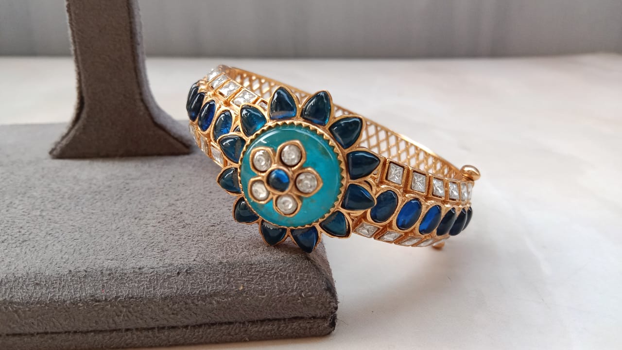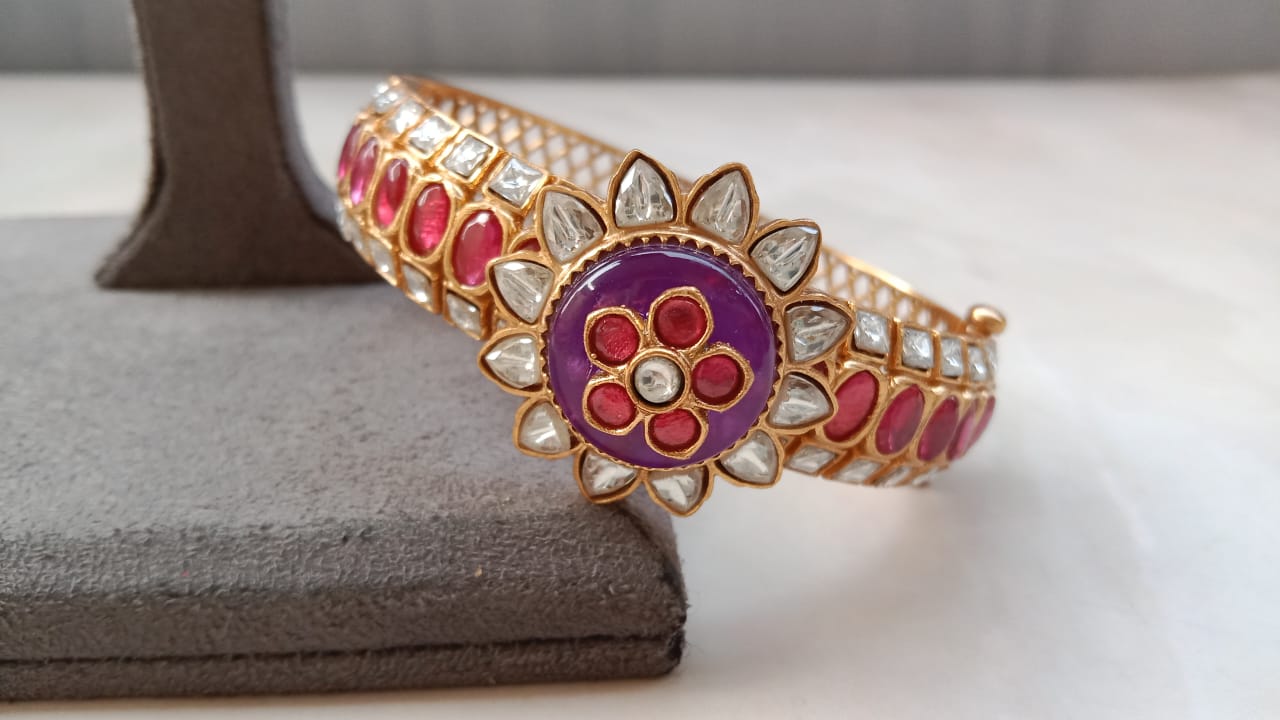 Add a regal charm to your look with this exquisite Kundan Floral Openable Bracelet, crafted to blend traditional elegance with modern sophistication. Featuring intricately set Kundan stones arranged in a graceful floral pattern, this bracelet shines beautifully with its premium gold-plated finish. The openable design ensures a secure and comfortable fit, making it perfect for festive celebrations, weddings, or everyday ethnic styling.
