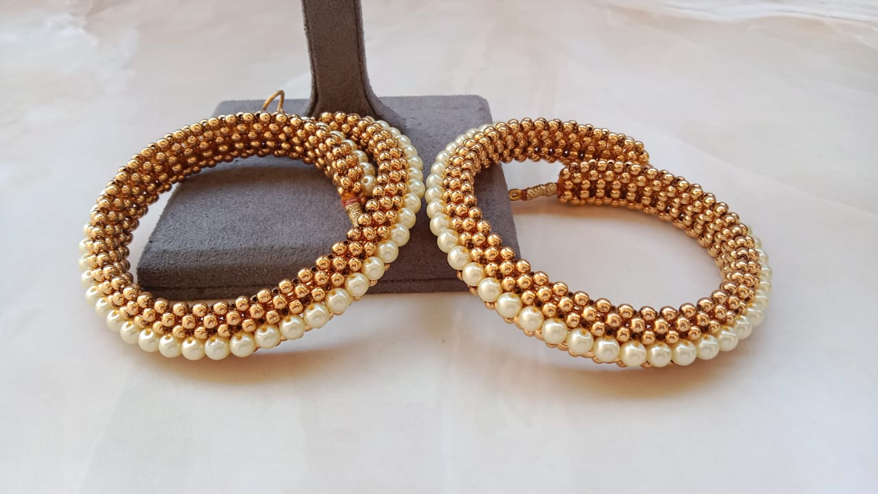 features a pair of beautifully handcrafted golden beaded kada-style bangles, designed to give a rich and royal traditional look. The bangles are intricately woven with multiple layers of glossy gold-toned beads, finished with a delicate row of classic white pearls on the outer edge.