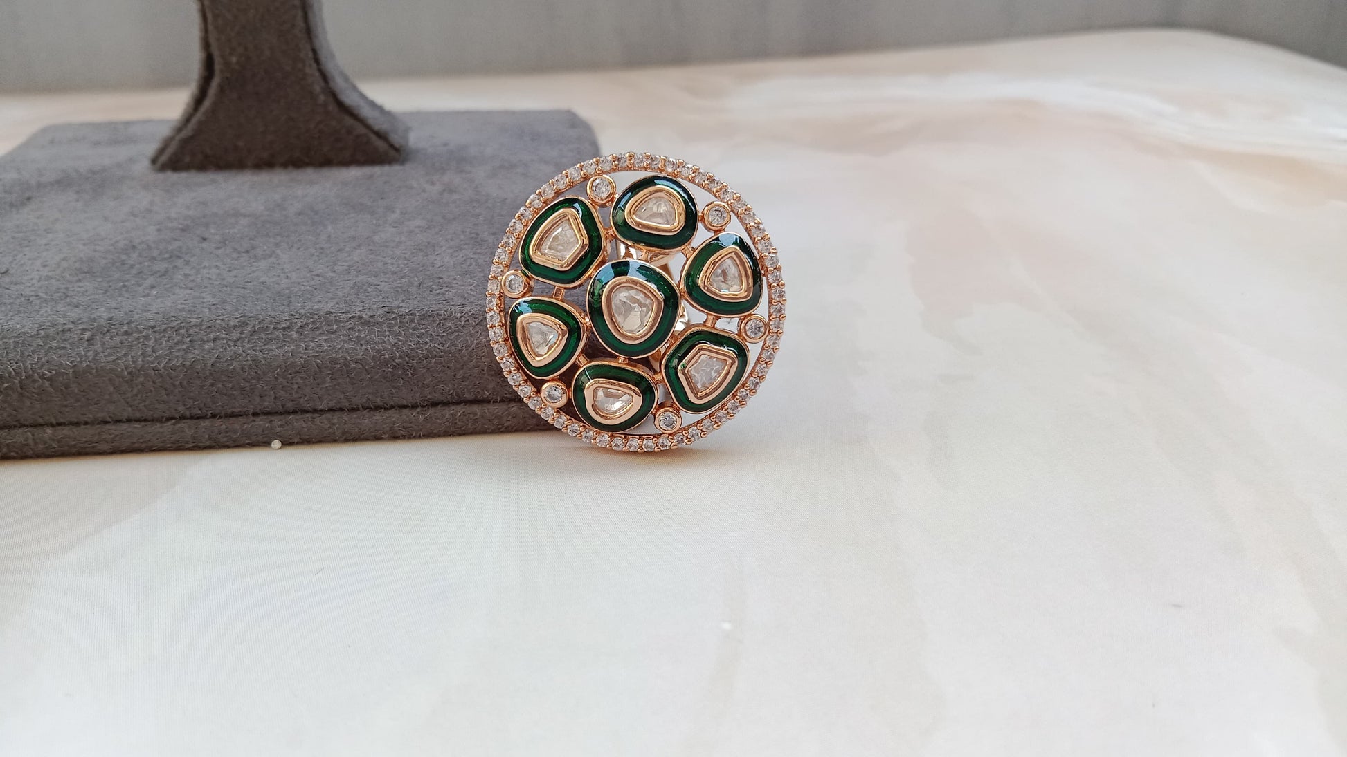 Add a hint of royal artistry to your look with this exquisite Meena work ring by Aryanz Jewellery. Crafted with intricate enamel detailing and finished in gold plating, this adjustable ring beautifully blends tradition with elegance. A perfect statement piece for festive occasions or everyday luxury styling.