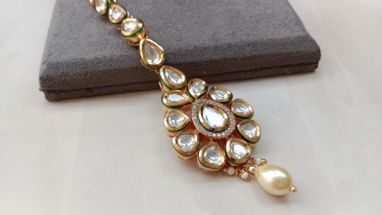 This beautifully crafted tikka features a graceful golden-plated design highlighted with delicate pearl drop hangings that add timeless elegance. Perfect for brides, bridesmaids, and festive looks, this tikka enhances any ethnic outfit with its subtle shine and traditional charm. Lightweight, elegant, and versatile—an ideal accessory for all special occasions.