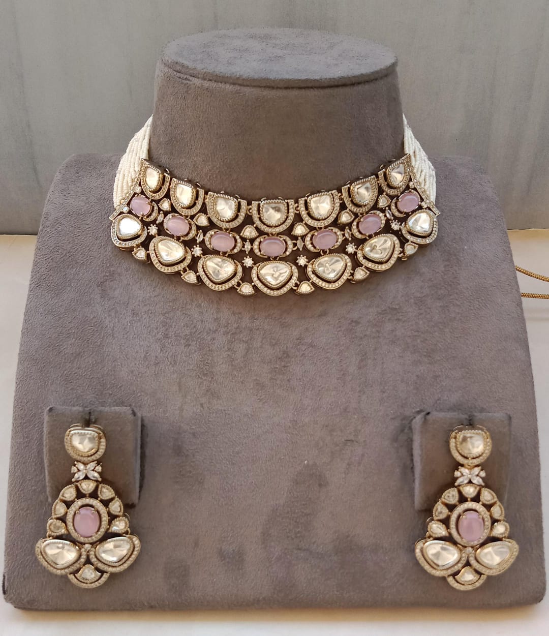 Kundan choker set designed for those who appreciate rich traditional artistry. The necklace features a beautifully layered pattern of classic Polki-style Kundan stones set in an antique gold finish. The choker is elevated with oval coloured stones available in emerald green and pastel pink, adding a graceful pop of colour to its regal structure.