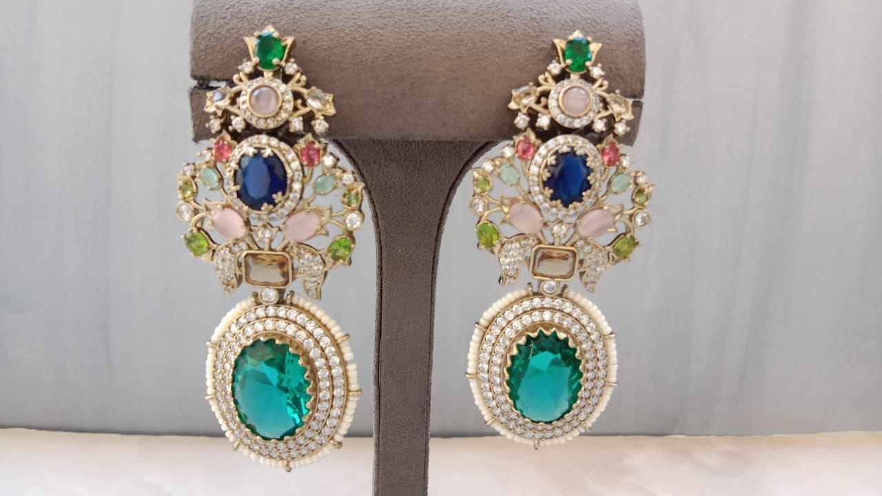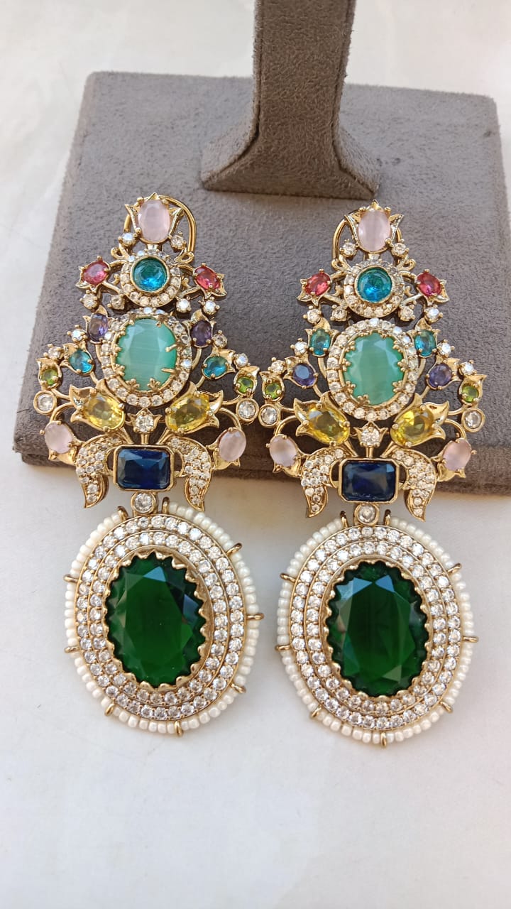 Striking pair of luxury earrings designed to make a bold and elegant statement. The earrings feature an intricate cluster of multicolour stones—emerald green, sapphire blue, ruby pink, aqua, and pastel hues—arranged in a beautifully detailed floral and ornamental pattern. Each stone is framed with fine CZ diamonds, adding unmatched sparkle and richness.