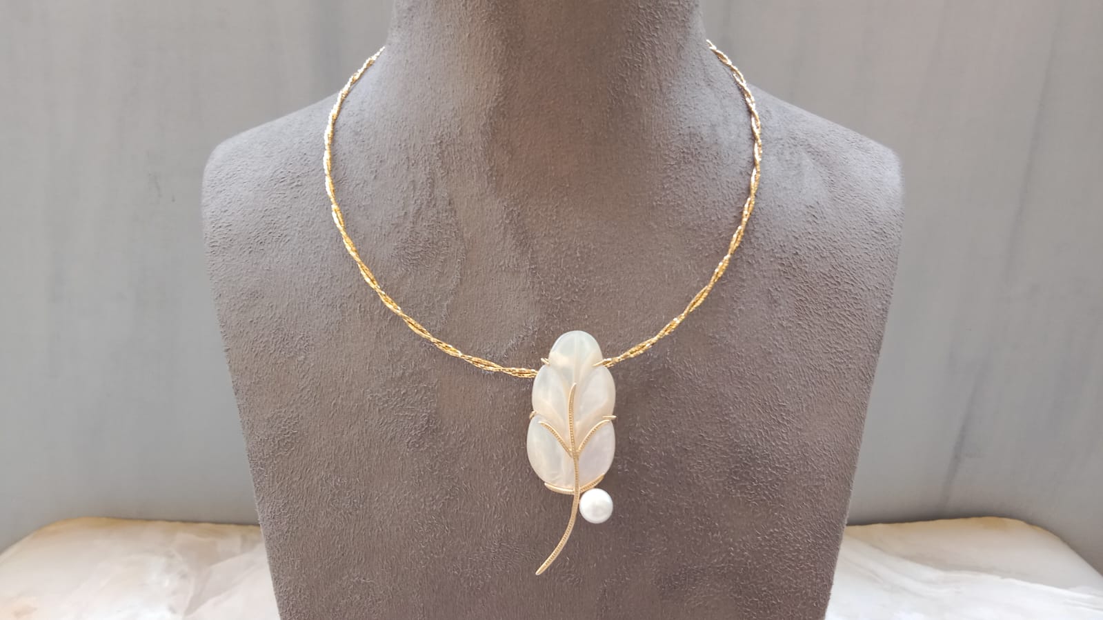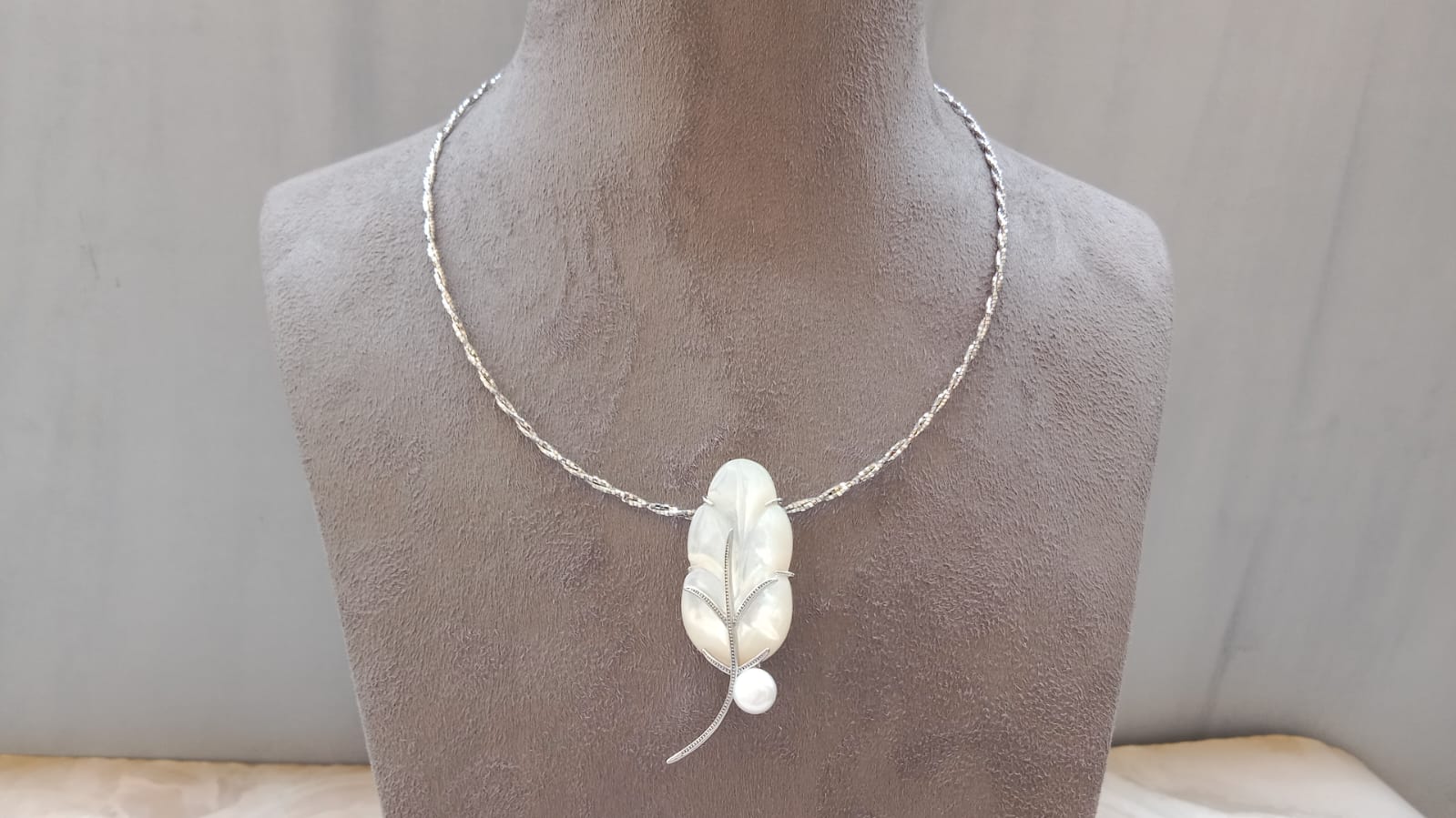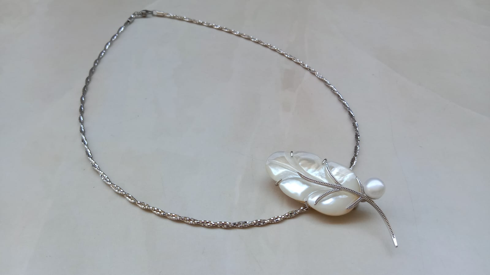 The pendant necklace brings elegance and versatility together in a timeless design. Featuring a leaf-inspired motif accented with shimmering Mother of Pearl (MOP) stonework, the pendant exudes natural beauty and sophistication. Designed for flexibility, the detachable pendant can be worn as a necklace or styled separately as a brooch, making it perfect for both casual and formal occasions. Whether dressing up a kurti, saree, or even a blazer, this multi-functional accessory is a must-have addition to your collection.