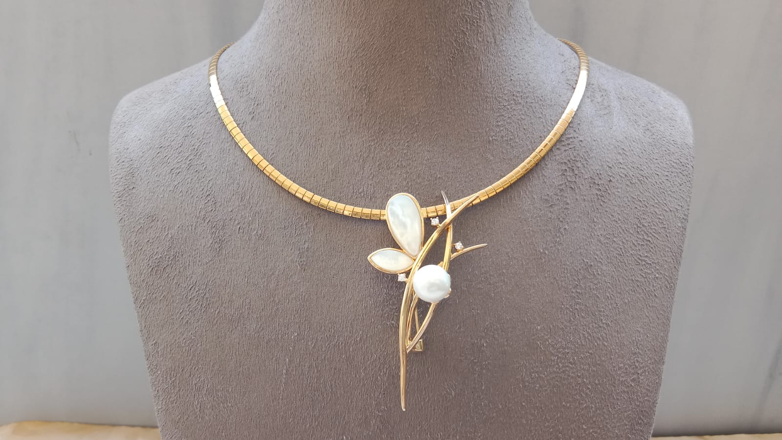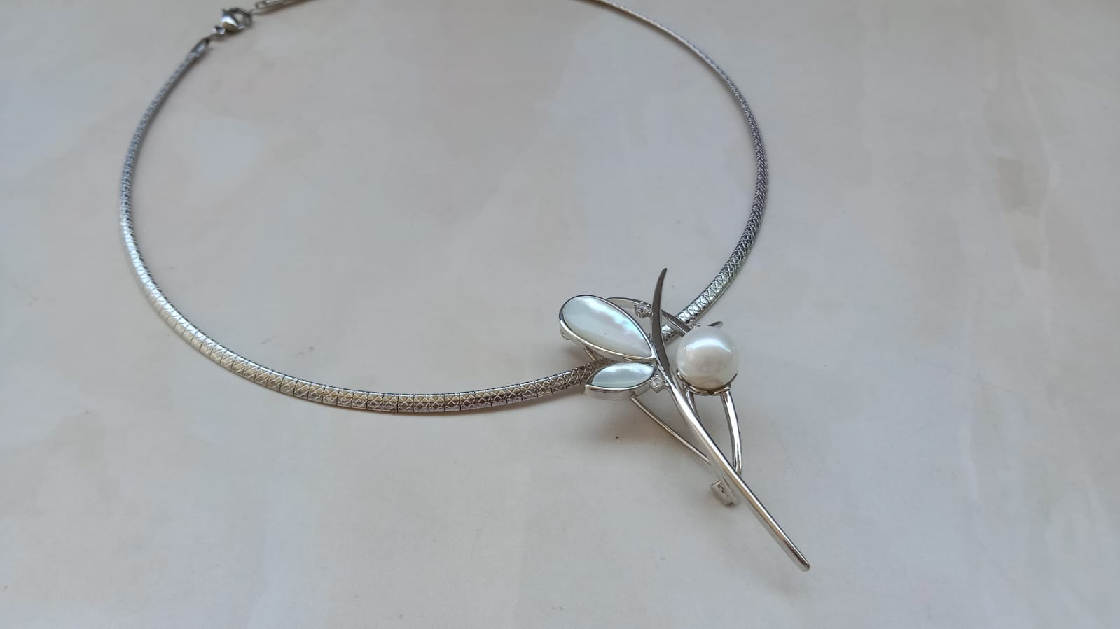 Elegant and multifunctional, the rodium and gold-plated pendant necklace is designed to complement any style with a touch of sophistication. The pendant showcases a refined Mother of Pearl (MOP) stone accented by a delicate pearl element, adding natural shine and charm. Designed with versatility in mind, the detachable pendant can also be worn separately as a brooch, making it an ideal accessory for both modern and traditional outfits. A graceful piece perfect for festive occasions, office wear, or gifting.