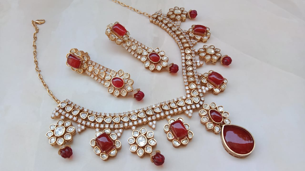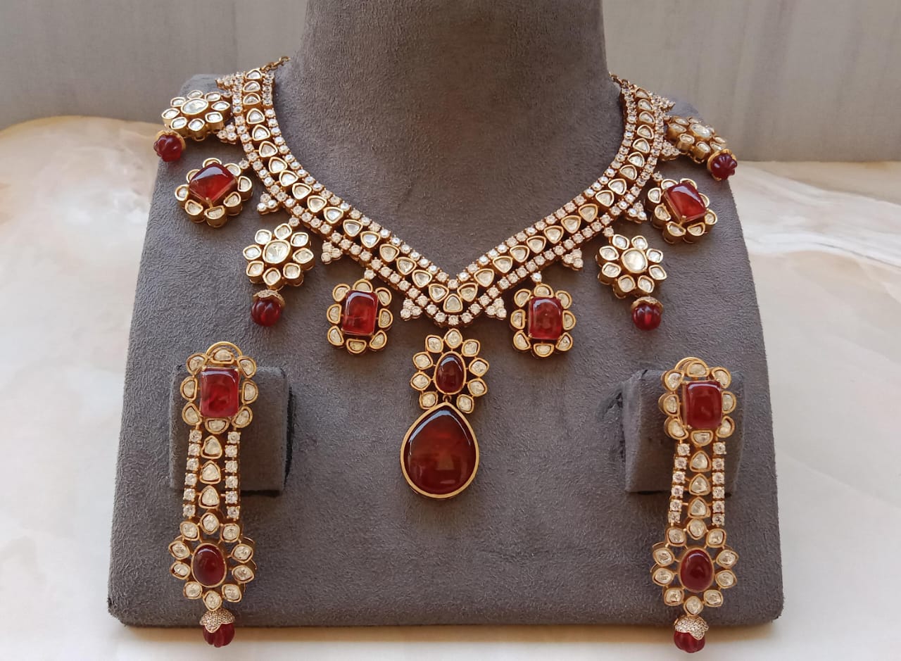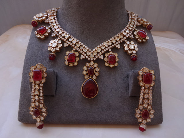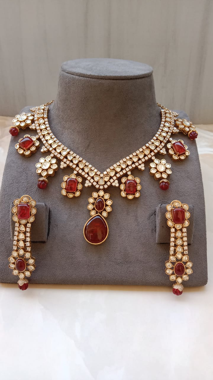 The vibrant red rubies paired with the luminous gold finish bring out a royal charm, while the matching earrings complete the ensemble for a graceful and versatile look. Perfect for pairing with sarees, lehengas, or bridal wear, this set adds a touch of heritage sophistication to your collection.